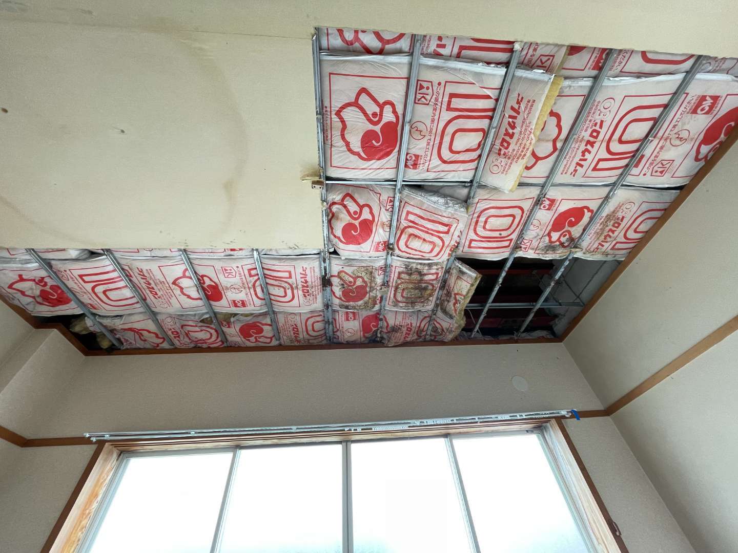 屋根が傷んでいた事もありますが、昔の断熱材はあまり性能も良くないので、天井裏の結露も原因だと思われます。長い間、結露と雨漏りがしていた為、ついに天井から雫がたれてくる程になり早急に対応しました。断熱材も入れ替えて少しは結露も防げるかと思います。昔の建物なので仕方ないのでしょうが、とりあえず一安心です☺